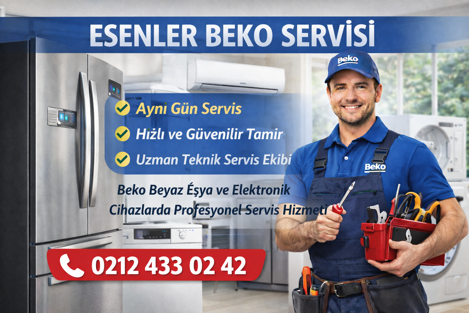 Esenyurt Beko Servisi olarak Beko marka beyaz eşya ve elektronik cihazlarınız için hızlı, güvenilir ve profesyonel teknik servis hizmeti sunuyoruz. Günlük yaşamda büyük önem taşıyan buzdolabı, çamaşır makinesi, bulaşık makinesi, fırın, klima ve kurutma makinesi gibi cihazlarda oluşan arızalara kısa sürede müdahale ediyor, kalıcı çözümler üretiyoruz. Esenyurt ve çevresinde sunduğumuz aynı gün servis hizmeti sayesinde…