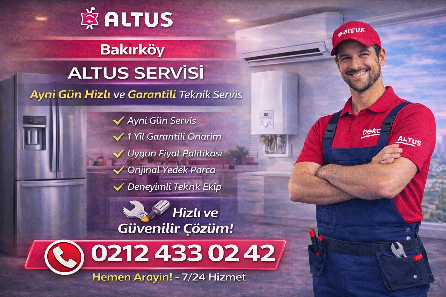 Bakırköy Altus servisi olarak, beyaz eşya ve elektronik cihazlarınızda oluşan tüm arızalara hızlı, güvenilir ve garantili teknik servis hizmeti sunuyoruz. Deneyimli teknik ekibimiz sayesinde arızalara kısa sürede müdahale ediyor, cihazlarınızı ilk günkü performansına kavuşturuyoruz. Ayrıca, aynı gün servis imkanı ile beklemeden profesyonel destek alabilirsiniz.
